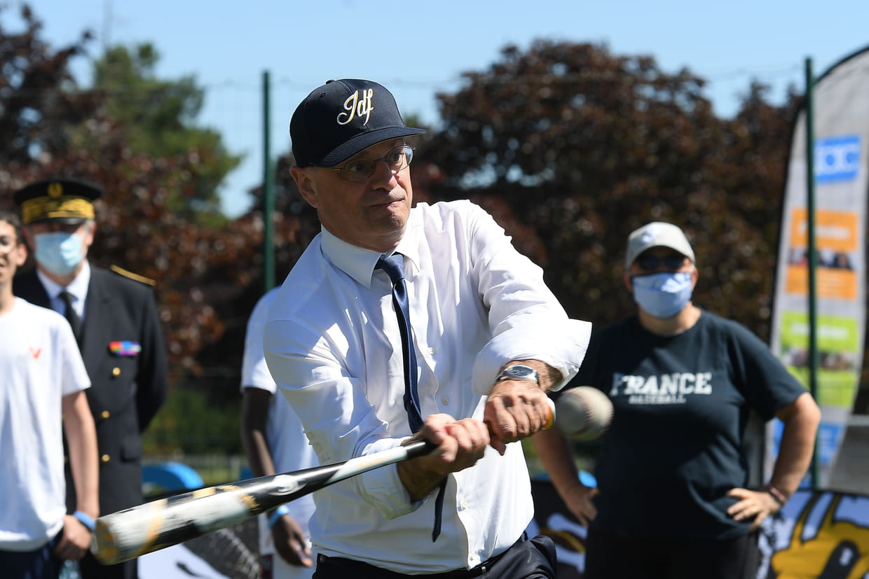 Le ministre de l'Education Nationale Jean-Michel Blanquer s’entraîne au baseball à Eaubonne (Val d'Oise), le 30 juillet 2020.