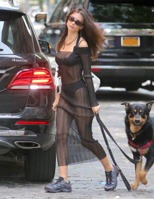 Charmante en toutes circonstances. Emily Ratajkowski a déambulé dans les rues de New York, vêtue d'une longue robe totalement transparente, permettant d'apercevoir le soutien-gorge et la culotte du mannequin de 30 ans, qui était en train de promener son chien.