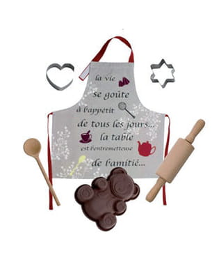 On craque pour ce set d'initiation à la pâtisserie destiné aux plus jeunes. Avec un tablier ajustable, un moule en silicone en forme d'ours, une cuillère en bois, un rouleau, deux emporte-pièces et trois recettes, voilà de quoi occuper vos chères têtes blondes le mercredi après-midi. Et partager un beau moment de complicité entre gourmands.