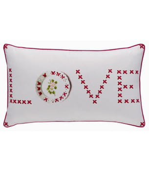 Hymne à l'amour et au charme désuet de la porcelaine anglaise, ce coussin en coton a été dessiné par la créatrice Ella Doran pour l'enseigne Habitat. Petit détail amusant et décalé, le mot "love" est écrit en point de croix.