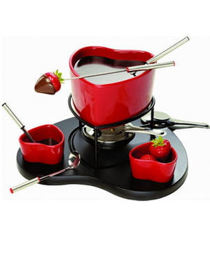 Ce service à fondue au chocolat en forme de cœur est prévu pour deux personnes. A vous les soirées en amoureux autour d'un bon chocolat fondant. Morceaux de fruits, de brioche, fraises Tagada, marshmallows, mini madeleines... On peut tout plonger dans une fondue au chocolat !