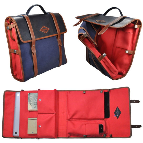 Voici un cartable destiné aux globe-trotteurs. Inspiré par les anciennes trousses à outils, il a été conçu pour ranger une tablette tactile, un ordinateur 13 pouces, un smartphone et son livre préféré. Bien sûr, on peut aussi y ranger ce qu'on veut ! Les détails sont soignés et la confection est solide.