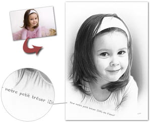 A partir de votre photo, notre artiste réalisera à la palette graphique un superbe dessin façon fusain. Vous pouvez indiquer un message ou une dédicace qui sera ajouté sous le portrait.