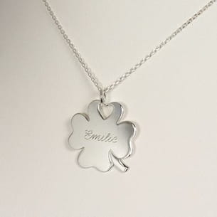Personnalisez à votre goût cet élégant pendentif en forme de trèfle en choisissant le collier (argent, plaqué or ou coton torsadé noir) et le texte à y graver.