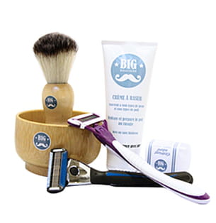 Le coffret comprend : la crème à raser made in France Big Moustache, à appliquer avec le bol et le blaireau, le rasoir de vos rêves et la pierre d'alun.
