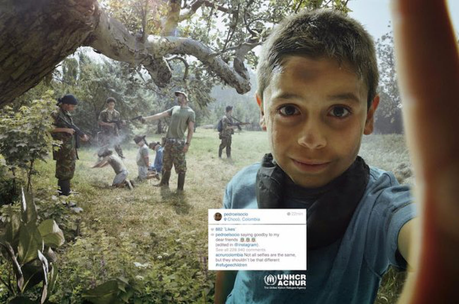 Cette initiative est le fruit de la collaboration entre l'Agence des Nations Unies pour les réfugiés UNHCR/ACNUR et le groupe publicitaire Sancho BBDO. Ces spots, largement mis en avant en Colombie, font preuve d'un cynisme sans faille au vu des légendes qui accompagnent les clichés de ces enfants vivant l'horreur, en posant pourtant tout sourire : "En train de dire au revoir à mes amis" ou encore "Si il y a à manger pour six, il peut y en avoir pour sept. Bienvenue à toi petit frère." Choquer pour mieux dénoncer. Des photos poignantes et difficiles, "postées" comme sur Instagram. Sans ses incontournables filtres.