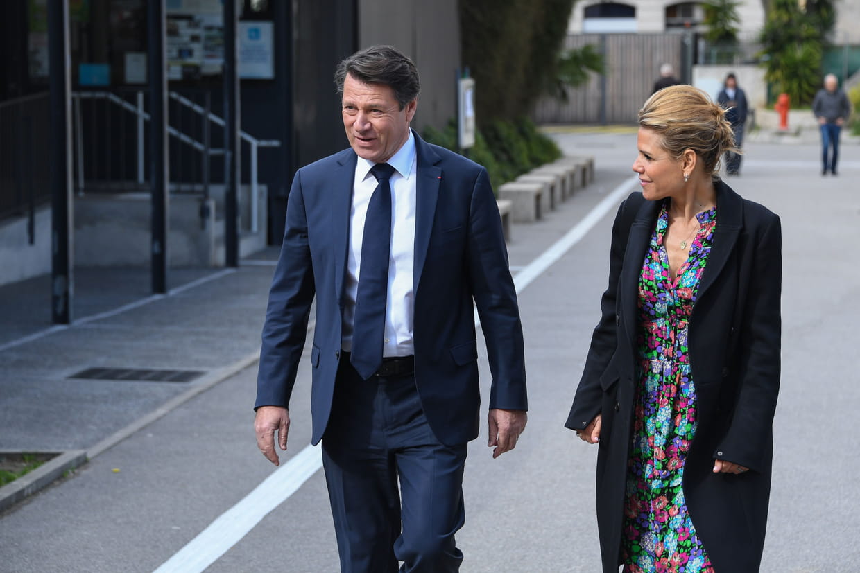 Christian Estrosi arrive au bureau de vote avec sa femme Laura Tenoudji