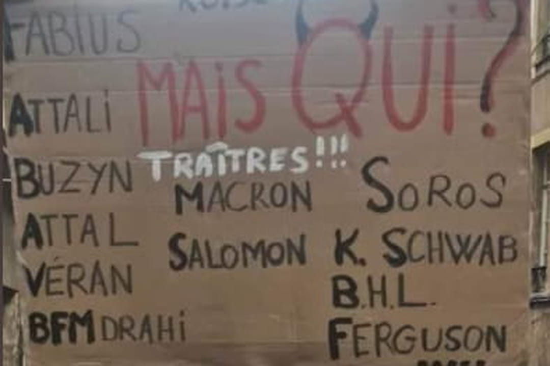 Samedi 7 août, un écriteau brandi lors d'une manifestation contre le pass sanitaire à Metz a suscité l'indignation sur les réseaux sociaux. On pouvait y lire des noms de personnalités politiques ou intellectuelles, certaines de confessions juives, avec le mot "traîtres" et le slogan "Mais Qui" écrits en gros.