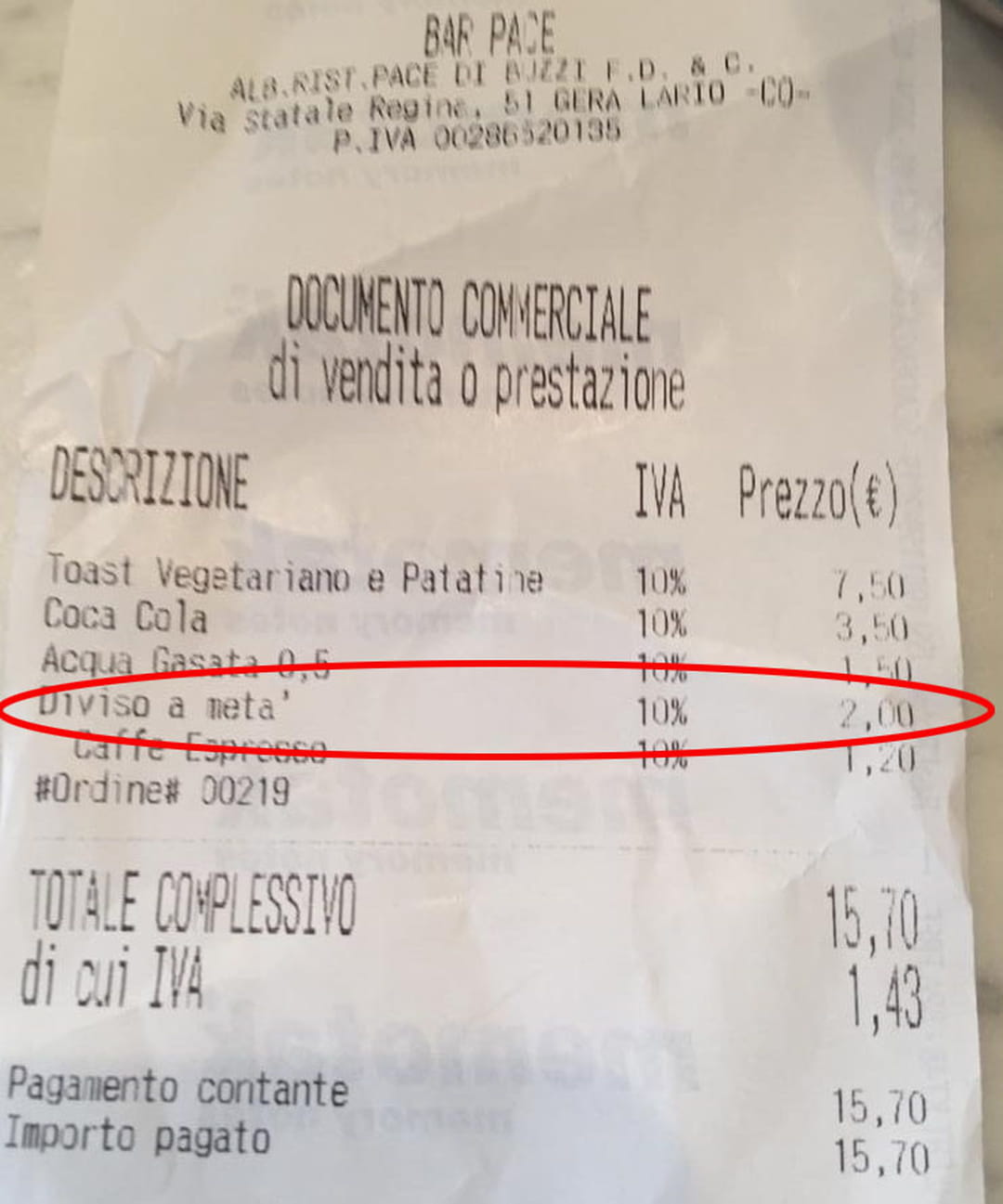 Ils étaient venus se restaurer au Bar Pace, dans la commune de Gera Lario, situé dans une région très touristique et romantique au bord du lac de Côme, en juin de cette année. Ils ont commandé un toast et comme beaucoup de personnes, ils ont décidé de le partager sauf qu'on leur a facturé un supplément pour avoir demandé un plat... servi en deux ! L'effort demandé en cuisine était pourtant proche du néant, notamment puisque le client indique que le toast était déjà coupé en deux dans sa version initiale, et qu'ils ont simplement demandé à le partager entre eux.