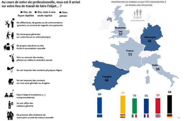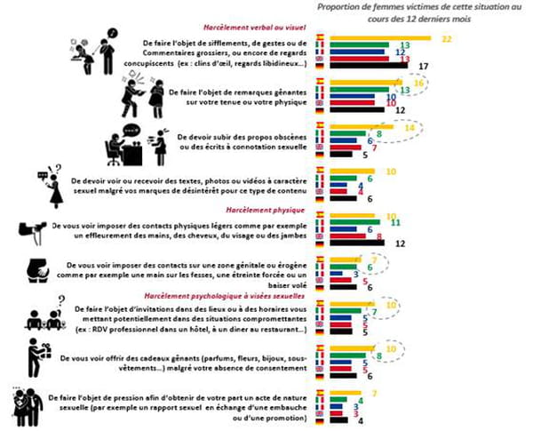 - Selon l'Ifop, 60% des femmes ont déjà été victime d'une forme de violence sexiste ou sexuelle sur leur lieu de travail. En tête des pays européens où les femmes sont les plus à plaindre, on retrouve l'Allemagne (68%), l'Espagne (66%) et l'Angleterre (57%). Les gestes et comportements déplacés (clins d'oeil, regards, sifflements) sont les cas les plus fréquents, surtout en Espagne d'après les chiffres, où 22% des femmes ont déjà fait l'objet de harcèlement visuel ou verbal.