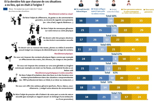 Il n'y a pas que les patrons et supérieurs hiérarchiques qui sont à l'origine de violences sexistes et sexuelles. Bien que ces derniers profitent de leur supériorité pour faire pression sur une femme en vue d'avoir des relations sexuelles avec elle (34%), les collègues et personnes extérieures (fournisseurs, clients...) à l'entreprise forment également une part importante !