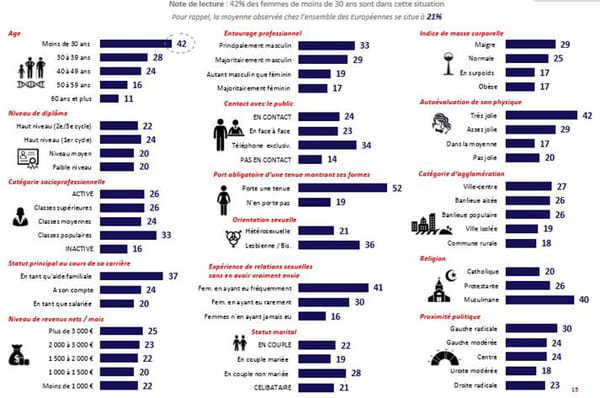 L'Ifop met un point d'honneur à dire que toutes les femmes ne sont pas égales face au comportement sexiste et aux violences sexuelles. Ainsi, les femmes victimes de harcèlement au travail sont plutôt jeunes (25-30 ans à 42%). Ceci peut s'expliquer par la vulnérabilité que l'on peut attribuer à ces jeunes femmes, bien qu'elles soient plus enclines à dénoncer ce genre de comportement par rapport à des femmes plus âgées (elles sont 42% des moins de 30 ans contre 24% des quadragénaires).