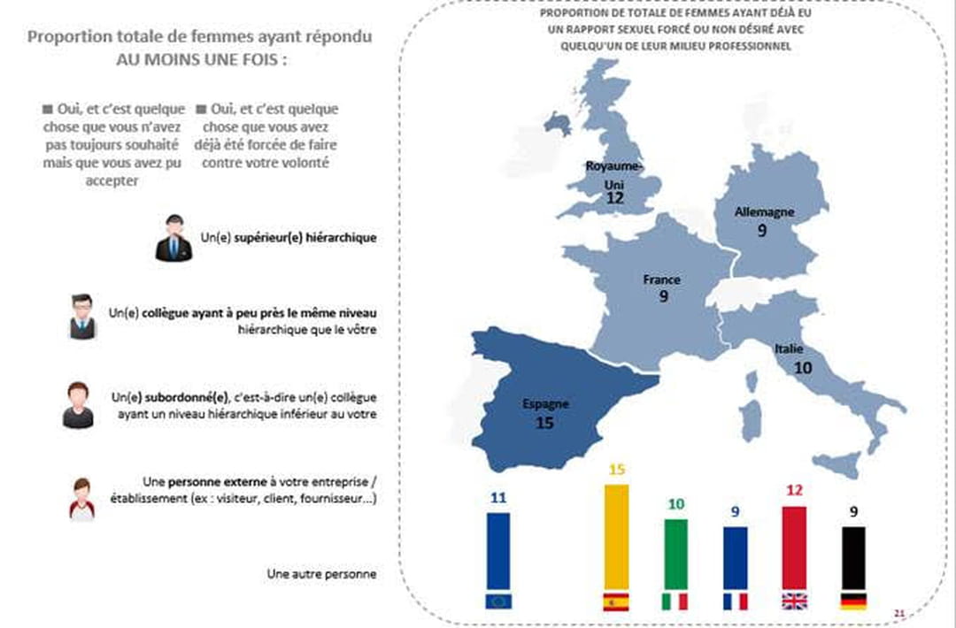 C'est en Espagne que ce phénomène d'intimidation est le plus important avec 15% des femmes qui ont déjà répondu à des avances sans réellement souhaiter avoir des relations sexuelles.