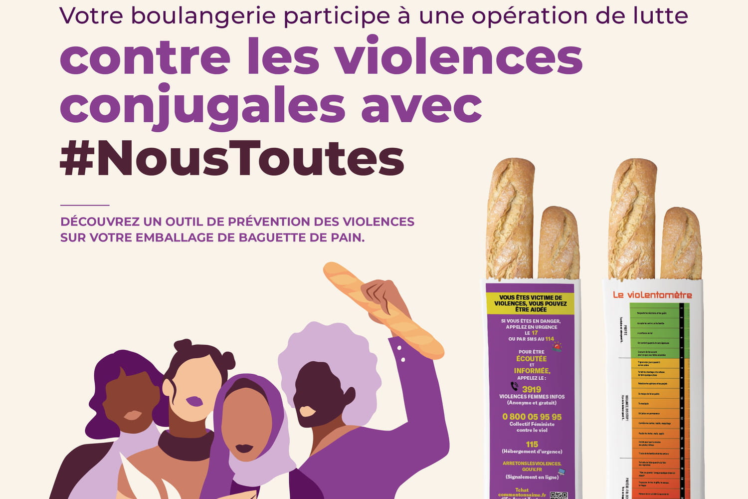 Le collectif féministe #NousToutes distribue du 19 au 27 mars 615000 sachets à pain dans les boulangeries, accompagnés de numéros utiles en cas de violences sexistes ou de maltraitance au sein du couple.