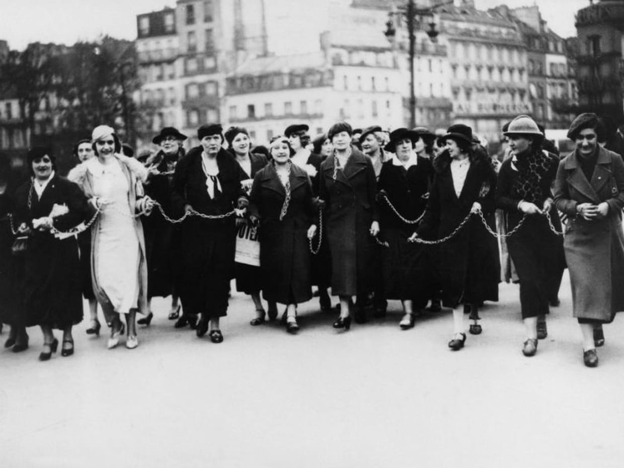 Louise Weiss manifeste en compagnie de suffragettes pour le droit de vote des femmes en 1935 à Paris.