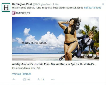 La pulpeuse jeune femme de 27 ans à la taille 46 et au tour de poitrine envoûtant apparaît sur une publicité dans les pages de papier glacé : alors qu’elle prend la pose telle une naïade au bord d’une piscine, ses formes de rêve font tomber à la renverse un beau jeune homme en costume. En légende : "Swim suits for all" ("Des maillots de bain pour tout le monde"), précédé du hashtag #CurvesInBikinis. On espère que ce mot-dièse fera fureur sur la Toile cet été.
