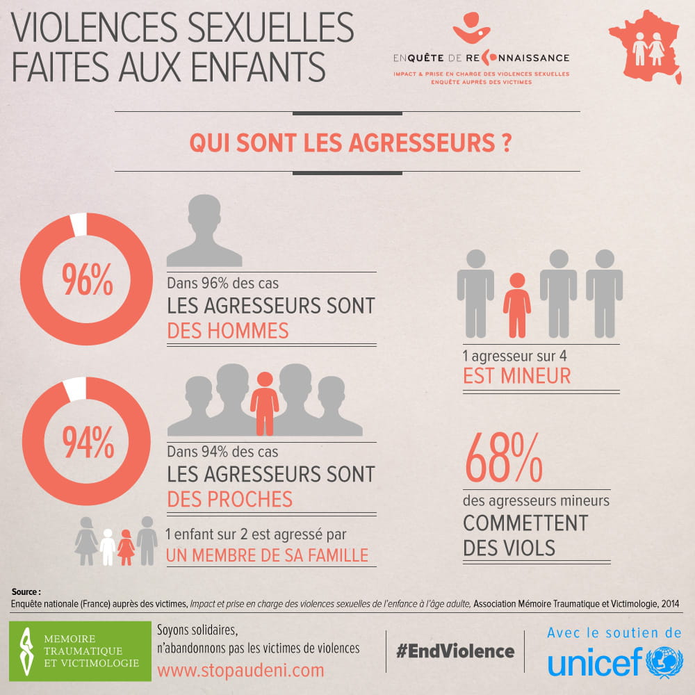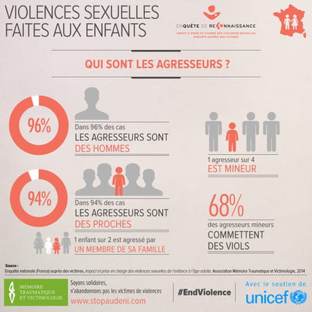 Une femme sur cinq et un homme sur quatorze se déclarent victimes de violences sexuelles. Des chiffres que l'on nous répète régulièrement, mais dont on sait au final peu de choses. Quand ces personnes ont-elles vécu l'horreur ? Dans quelles circonstances ? Comment se sont-elles reconstruites après ? Quel a été leur parcours ? C'est pour combler ces blancs et en amont de la Journée de la Femme que l'Unicef et l'association Mémoire Traumatique et Victimologie ont lancé une grande enquête et interrogé 1 214 personnes (dont 95 % de femmes) ayant subi des violences sexuelles au cours de leur vie.