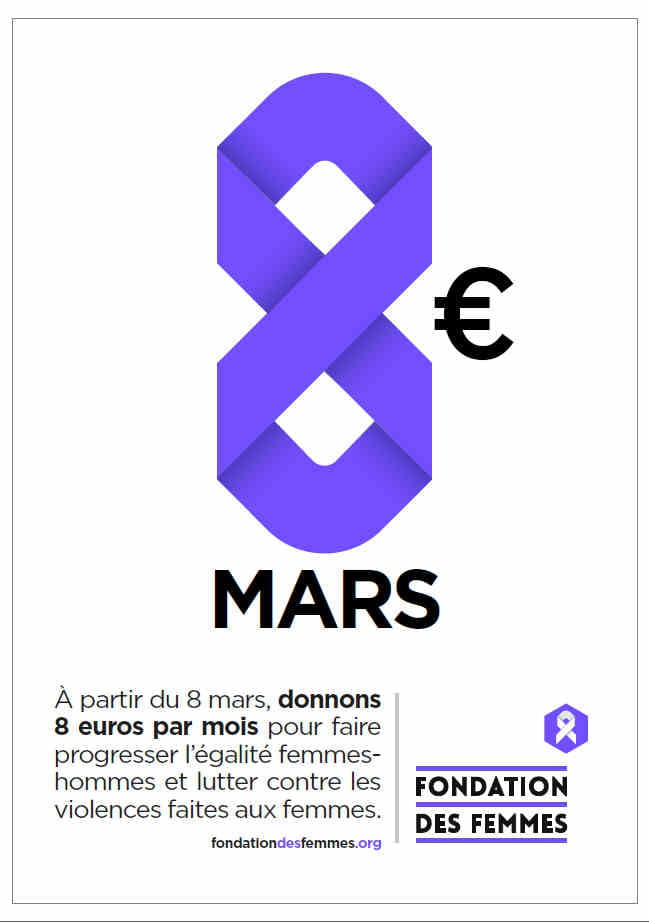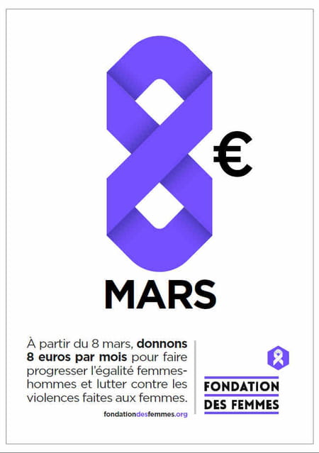 Différence de salaires, plafond de verre, violences, hypersexualisation, menace du droit à disposer de son corps, atteintes à la liberté... sont autant de fléaux qui continuent de paralyser les femmes. S'il est important de le rappeler tout au long de l'année et d'en remettre une couche le 8 mars, il est tout aussi indispensable de dépasser les simples paroles pour passer à l'acte. Dans cet esprit, la toute nouvelle Fondation des Femmes lance un appel aux dons : #8eurostousles8, pour être prélevé mensuellement et agir en faveur du droit des femmes, dans son ensemble. L'argent ainsi récolté est reversé aux associations de terrain qui manquent de fonds pour concrétiser leurs projets.