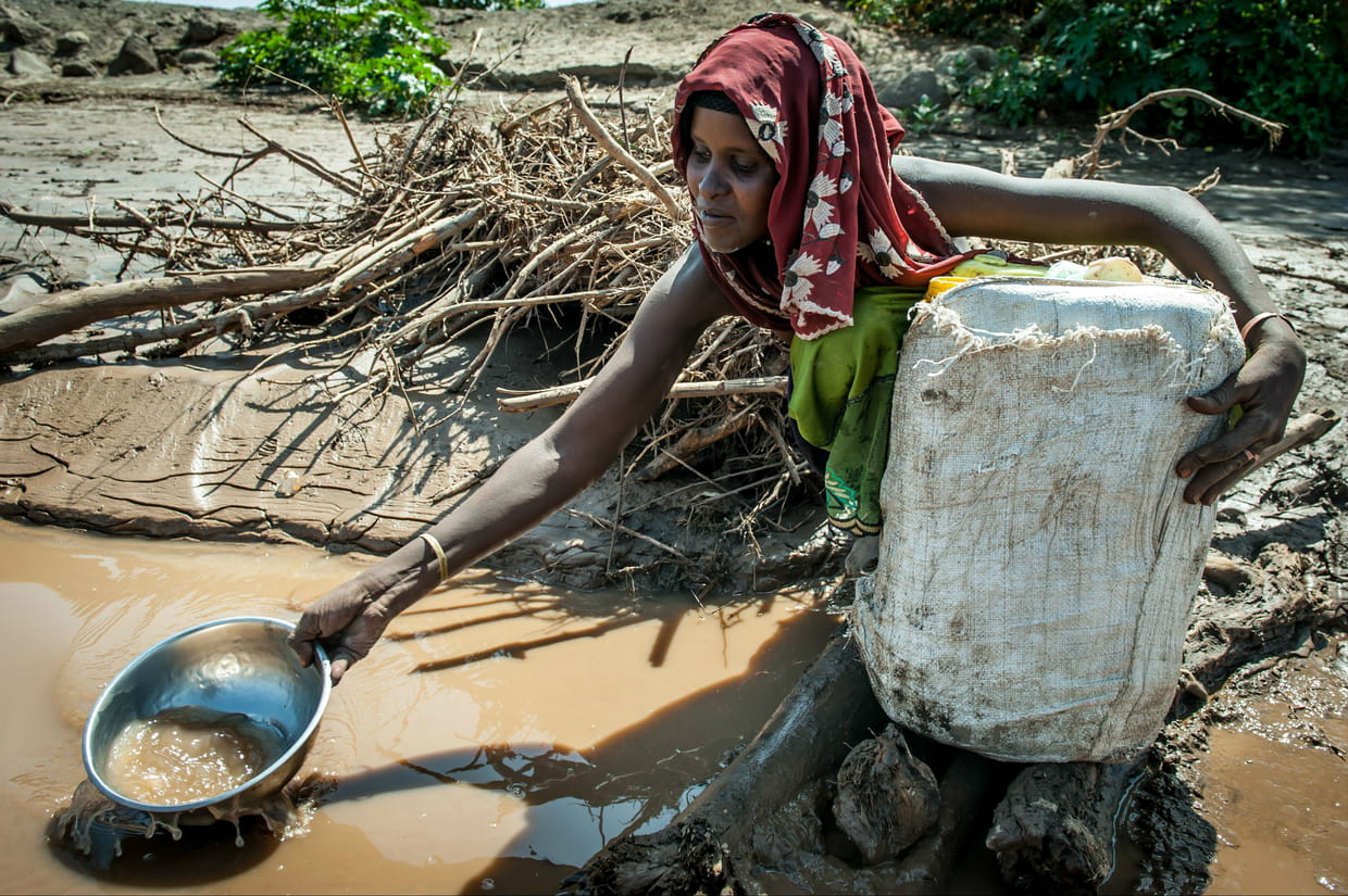 Trois jours avant que cette photo ne soit prise, il a plu pour la première fois en 2016 dans cette zone. Les averses ont créé un petit point d'eau dans une rivière desséchée, où les familles viennent s'approvisionner, même si l'eau n'est pas potable ici.