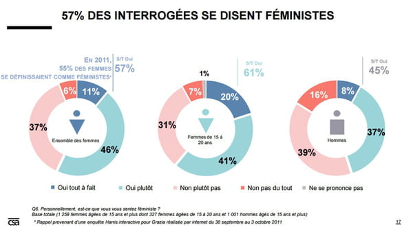 Les hommes sont cependant conscients du sexisme subi par les femmes. Sur cent, 94 admettent que les femmes sont ciblées par des injustices et humiliations à cause de leur sexe (contre 99 % chez les principales concernées). Autre nouvelle réjouissante : 45 % des sondés s'estiment féministes, face à 57 % des interrogées. Pour la grande majorité des deux sexes, la défense des droits des femmes reste un combat à mener : à 79 % pour les femmes, à 84 % pour les jeunes filles et à 71 % pour les hommes.
