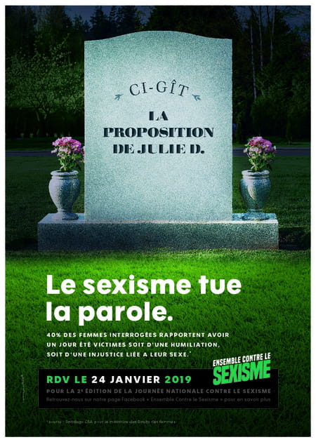 Couronne de fleurs, pierre tombale, urne funéraire : autant d'objets symboliques où viennent s'apposer les espoirs et envies tués par le sexisme. Sur l'une, on peut lire l'épitaphe suivante : "Ci-gît la proposition de Julie D.". Une manière de rappeler que les femmes sont peu écoutées, que leur avis n'est pas toujours pris en compte et que le "sexisme tue la parole".