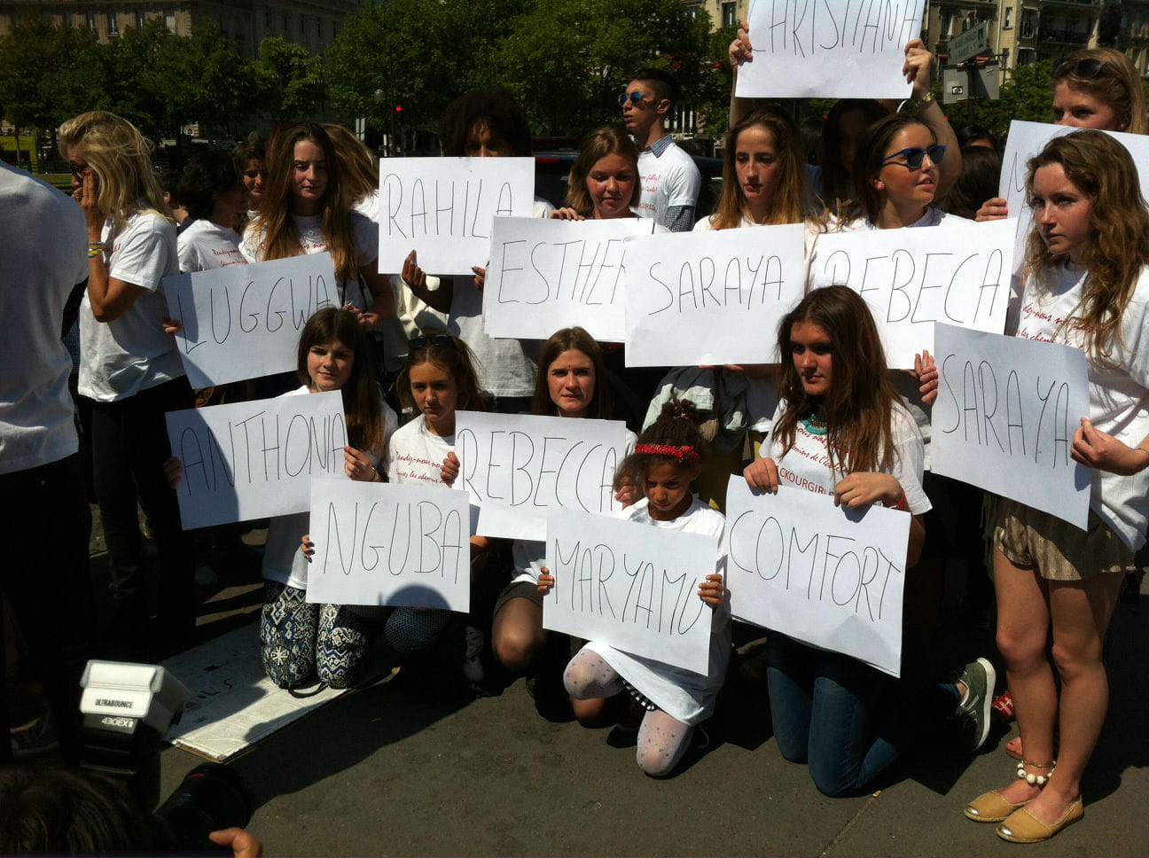 Tandis que François Hollande tente de jouer un rôle de médiateur et de coordinateur entre les pays francophones et anglophones de cette partie de l'Afrique occidentale, son ex-compagne, Valérie Trierweiler, a pris l'initiative d'organiser de nouveau un rassemblement au Trocadéro au même moment, le hashtag #bringbackourgirls étant le slogan fédérateur. Sur place, elle est rejointe par des personnalités comme Yamina Benguigui mais aussi des lycéennes, particulièrement touchées par l'enlèvement des jeunes Nigériennes, arborant les prénoms de ces dernières en signe de soutien.