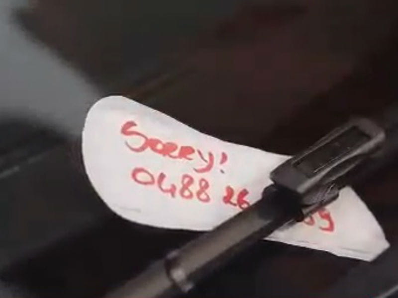 Mauvais goût. Pour s'excuser d'avoir stationner son véhicule au mauvais endroit, la femme écrit "Sorry" accompagné de son numéro de téléphone au rouge à lèvres sur une serviette hygiénique. Classe.