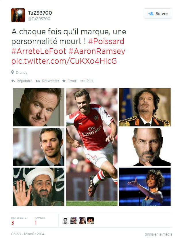 La malédiction du joueur de foot Aaron Ramsey continue. Dimanche dernier, Arsenal a remporté le Community Shield face à Manchester United et devinez qui a marqué un but ? Aaron Ramsey ! Le Lendemain, on apprenait le décès de la star Robin Williams. Et ce n'est pas la première fois que cela arrive ! L'affaire remonte au 1er mai 2011. Ramsey marque un but contre l'équipe de Manchester United. Le lendemain, Oussama Ben Laden était tué. L'évènement se reproduit quelques mois plus tard avec un tir face à Tottenham et la mort de Steve Jobs. Ses buts auraient coïncidé également avec les morts de Kim Jong-il, du colonel Kadhafi ou encore de Whitney Houston. Le dernier "coup" date du 30 novembre 2013 où son but contre Cardiff était simultané du décès de Paul Walker.