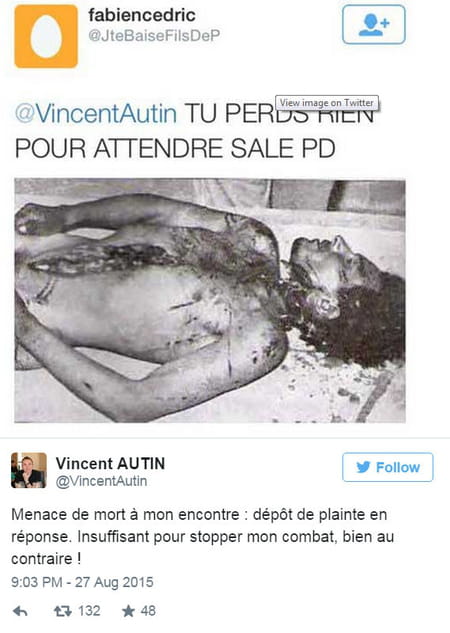La fois de trop. Vincent Boileau-Autin, le premier marié gay de France, a porté plainte après avoir de nouveau reçu des menaces de mort, principalement sur Twitter. Il y a quelques jours, celui qui est président de plusieurs associations LGBT s’est fait invectiver par un internaute. "Tu ne perds rien pour attendre, sale PD", lui a assené un twitto en accompagnant son message de la photo d’un cadavre.