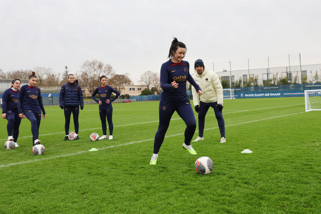 Après avoir enfilé ma tenue aux couleurs du Paris Saint-Germain, je me sens déjà l'âme d'une Marie-Antoinette Katoto, Lieke Martens ou Sakina Karchaoui. L'agilité balle au pied en moins. Le staff de l'équipe nous accueille chaleureusement (et nous en avons besoin, il fait 6°C sur le terrain). La séance commence par un court échauffement sous la houlette du préparateur physique, Guillaume Denis. Sous son commandement, nous sommes directement plongés dans le bain : étirements dynamiques, exercices de mobilité et sprints sur fond de pierre/feuille/ciseaux. Jusqu'ici, tout va bien. La suite du programme concocté par Jocelyn Prêcheur se décompose en trois ateliers : le premier pour travailler les passes, le deuxième axé sur la conduite du ballon et le dernier sur les tirs. Le tout sous le regard des joueuses de l'équipe féminine. Ma marraine du jour s'appelle Nicole Payne. Arrivée au PSG en juillet dernier, l'Américaine de 22 ans, originaire d'Alabama, occupe le poste de défenseure. Son objectif : me faire prendre confiance et me donner des conseils techniques. Elle me montre comment mieux placer mon pied pour tirer en hauteur (et miracle, j'ai aussitôt réussi à placer mes trois frappes dans le but), m'encourage sur chaque course balle au pied et se questionne sur la future célébration de mes buts. Spoiler alert : j'ai opté pour "l'avion", un classique qui fait toujours son petit effet. Durant une heure, on s'amuse à croiser nos passes, slalomer entre des plots et tirer en évitant les mannequins positionnés pour bloquer l'accès aux cages. Et sans même que l'on s'en rende compte, il est déjà l'heure de retirer nos crampons. Verdict, je n'ai pas vu passer le temps, comme tous-tes les autres chanceux-euses présent-e-ssur le gazon du Camp des Loges.