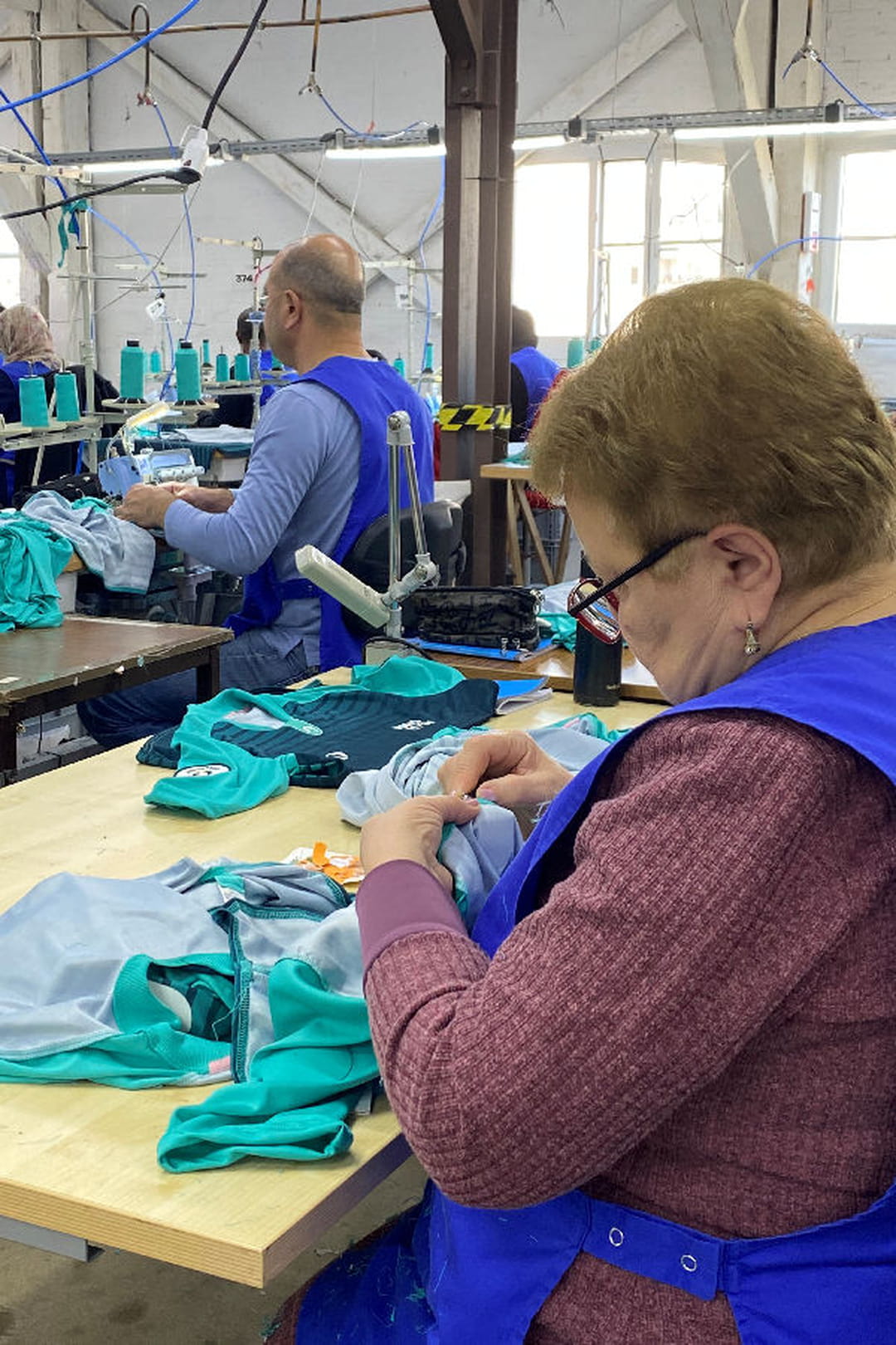 Un coiffant, une paire de chaussures, un bas, une veste, quatre paires de chaussettes et deux sacs, voilà ce que chaque engagé-e recevra pour aiguiller les touristes et les fans de sport à travers la capitale. À toutes ces pièces s'ajoute l'élément phare de la tenue : le T-shirt. Fabriqués en France, les 250 000 tops en polyester recyclé bleu vif tissé au Vietnam ont nécessité plus de 24 mois de travail. 100 000 de ces T-shirts au design inspiré de l'incontournable marinière sont fabriqués chez Fil Rouge "par une équipe de salarié-e-s en réinsertion professionnelle", précise Jean-François Aufort, président de l'entreprise phocéenne. Pour Kathleen Mitschi, employée sur la chaîne de production, contribuer à un événement d'une telle ampleur est une fierté. "J'ai moins de pression au bout de neuf mois de travail, mais au début, j'avais peur de rater quelque chose", explique la jeune femme. "On a travaillé entièrement sous embargo, on n'avait pas le droit de parler de quoi que ce soit, mais on s'habitue."
